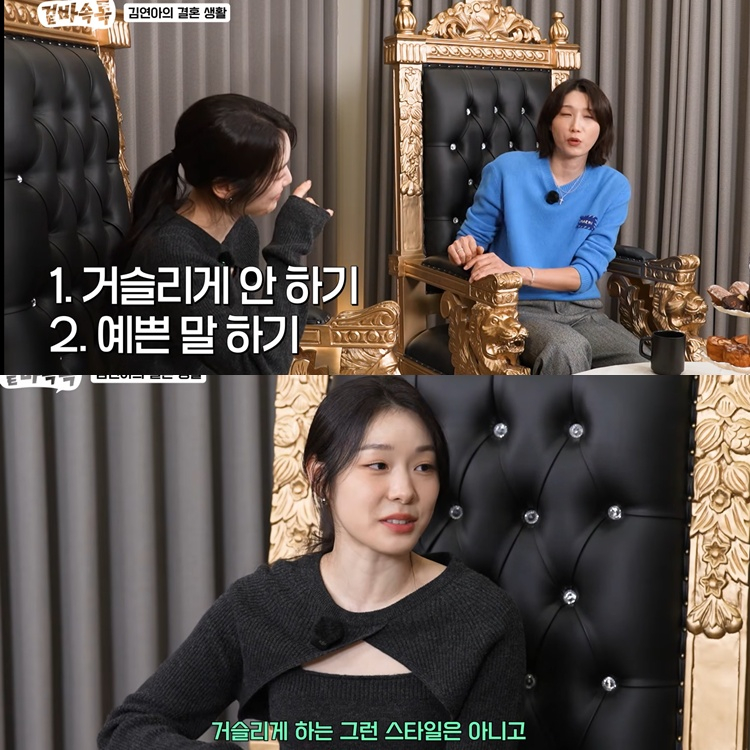 결혼 후 일상에 대해서도 언급했다. 김연아는 “맛있는 걸 먹고, 좋은 카페에서 커피를 마시는 소소한 시간을 보낸다”며 평범하지만 안정적인 신혼의 행복을 전했다. 김연경이 “고우림 씨가 잘 보이려고 예쁜 말만 한다더라”고 전하자, 김연아는 “저 그런 사람 아니다”라며 억울한 표정을 지어 웃음을 자아내기도 했다.
