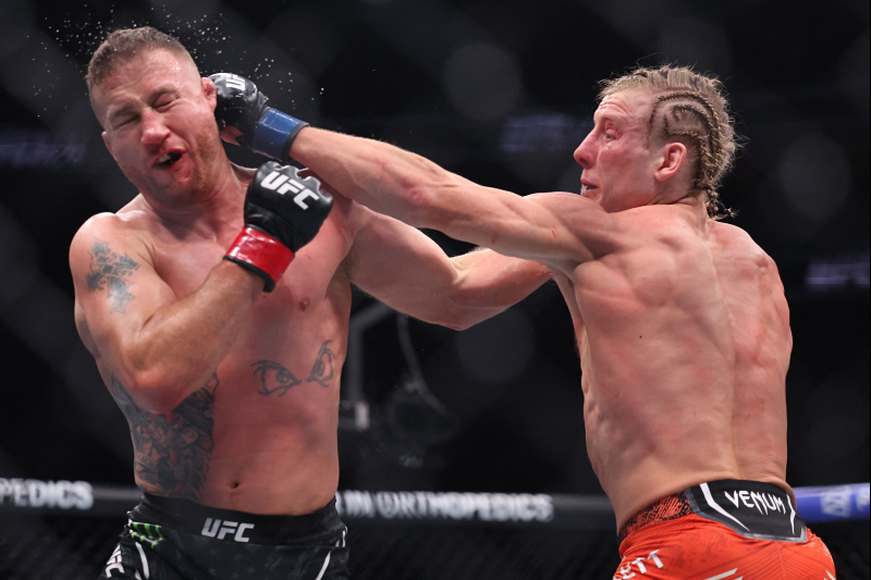 UFC 라이트급 잠정 챔피언이 된 저스틴 게이치. 사진=UFC 엎치락뒤치락했다. 4라운드에는 핌블렛이 게이치의 주먹에 맞고 휘청였다. 테이크다운 시도도 느릿했다. 게이치에게 거듭 펀치를 허용했고, 핌블렛은 쓰러져도 계속 일어났다. 2분 40여 초를 남기고도 핌블렛이 여러 차례 큰 펀치를 맞았으나 쓰러지고 또 일어났다. 그야말로 ‘좀비 모드’였다. 둘은 4라운드 막판 치열한 공방을 주고받으며 박수갈채를 끌어냈다.