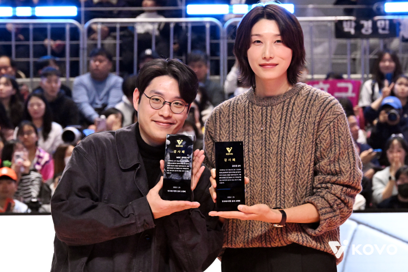 김연경은 25일 강원도 춘천 호반체육관에서 개최된 2025~26 V리그 올스타전에 수상자 자격으로 참석했다. 그는 지난 시즌을 마친 뒤 은퇴했고, 지난해 인기리에 방영한 예능 프로그램 '신인 감독 김연경'을 통해 배구 흥행 도우미로 나섰다. 한국배구연맹(KOVO)은 이날 올스타전에서 이 프로그램 권락희 PD와 함께 김연경에게 감사패를 전달했다.