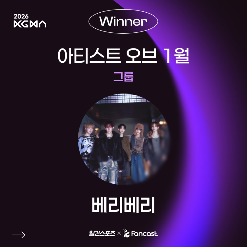 이번 투표는 1월에 데뷔한 그룹을 대상으로 후보를 선정해 진행됐다. 2019년 1월 9일 데뷔한 베리베리는 글로벌 팬덤의 지지를 바탕으로 ‘2026 KGMA 아티스트 오브 먼스’ 그룹 부문 트로피의 주인공이라는 영예를 안았다. 마지막까지 치열한 경쟁을 펼친 프로미스나인은 1153표를 기록하며 2위에 이름을 올렸다.