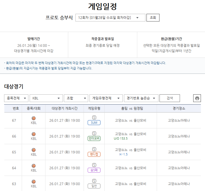 서울올림픽기념국민체육진흥공단(이사장 하형주)이 발행하는 체육진흥투표권 스포츠토토의 수탁사업자 한국스포츠레저㈜가 오는 27일 오후 7시에 고양소노아레나에서 열리는 2025~26시즌 국내 남자 프로농구(KBL) 고양 소노-울산 현대모비스전을 대상으로 한 프로토 승부식 12회차의 발매 마감이 임박했다고 밝혔다.