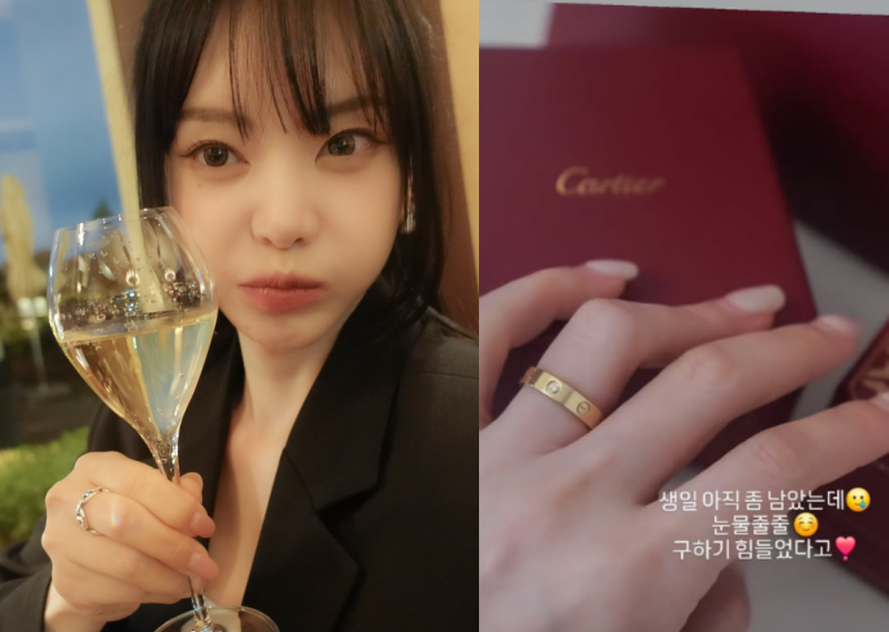 공개된 사진에는 명품 브랜드 C사 반지를 착용한 서유리의 손이 담겼다. 프러포즈 및 예물 반지로도 사랑받는 해당 브랜드의 반지를 선물 받고 약지에 착용한 그는 눈물 이모티콘을 덧붙여 감격을 드러냈다.