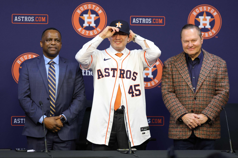 지난 5일(한국시간) 휴스턴 애스트로스 입단식을 치른 이마이 타츠야. 오른쪽은 에이전트 스콧 보라스. Alex Slitz/Getty Images/AFP (Photo by Alex Slitz / GETTY IMAGES NORTH AMERICA / Getty Images via AFP)/2026-01-06 09:48:43/ <저작권자 ⓒ 1980~2026 ㈜연합뉴스. 무단 전재 재배포 금지, AI 학습 및 활용 금지> 메이저리그(MLB) 디펜딩 챔피언을 행선지에서 지우고 이겨야 할 팀으로 본 남자, 이마이 타츠야(27·휴스턴 애스트로스)가 빅리그 진출에 대한 자신의 생각을 전했다.