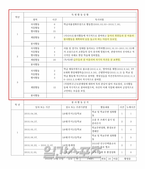 사진=골든보이스 제공. A 대표는 이같은 입장과 함께 황영웅의 학창시절 생활기록부도 공개했다. 이에 따르면 황영웅은 학창시절 학급자율정화부장으로 활동했고, 봉사활동에도 적극 참여했다. 또 수학여행 조장으로 조원들의 질서 유지에 힘썼다는 내용을 비롯해 고등학교 시절 학교 및 학교 주변 정화활동 등 봉사활동에 참여하기도 했다.