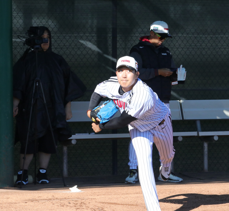 올해 첫 불펜 피칭에서 직구 최고 구속은 140㎞/h가 나왔다. 지난해 두 번째 불펜 피칭(최고 136~137㎞/h) 보다 구속이 더 높게 나왔다. 손주영은 "지난해보다 2주 정도 빠른 페이스"라고 소개했다. 김광삼 LG 투수 코치는 "(손)주영이는 원래 페이스가 빠른 선수가 아니다. 그럼에도 준비가 잘 되어 있다"면서 "좋은 환경에서 몸을 만든 효과가 분명히 보였다. 지난해 좋은 성적을 낸 이유를 다시 한번 확인할 수 있었다"고 반겼다. 김 코치는 WBC 대표팀 투수 코치도 겸하고 있다. 손주영이 미국 애리조나 캠프에서 불펜 투구를 하고 있다. 사진=구단 제공 손주영은 "데이터팀에서 투구 시 옆과 뒤에 카메라 두 대를 설치해 손의 그립과 스플리터 궤적까지 보여주며 피드백해 줘 효과적인 투구가 가능했다"라면서 "사이판에서 비교적 일찍 몸을 만들어온 것도 도움이 된 것 같다"고 말했다. 손주영은 1월 9일부터 21일까지 진행된 사이판 캠프에 다녀왔다.