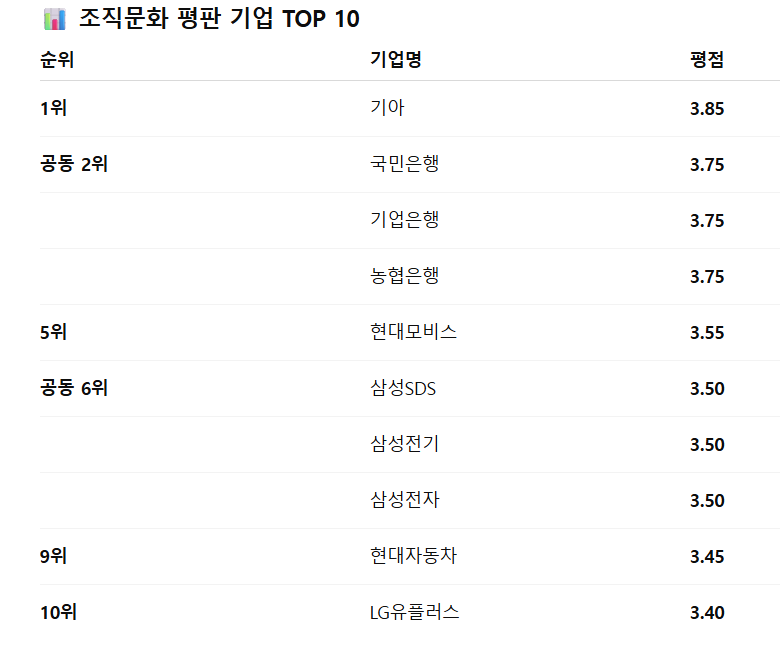 또 현대모비스(3.55점), 삼성SDS·삼성전기·삼성전자(3.5점), 현대자동차(3.45점), LG유플러스(3.4점)가 톱 10에 포함됐다.