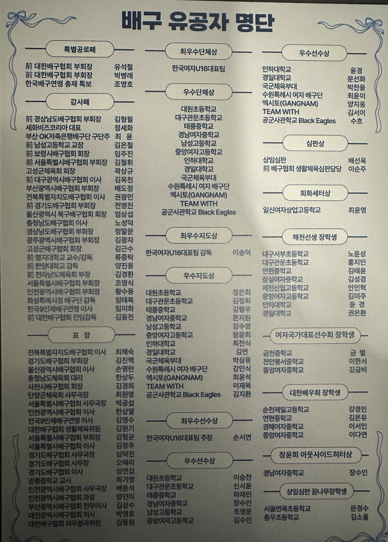 U-16 대표팀은 최우수선수상 손서연을 비롯해 최우수지도자상(이승여 감독) 최우수단체상 등 3관왕을 달성했다. 이 외에도 회화세터상, 해천선생장학금, 한국여자배구국가대표선수회 장학금, 대한배우회 장학금, 대한배구협회 상임심판 꿈나무장학금과 올해 신설된 장윤희아웃사이드히터상 등이 유소년 배구 선수에게 전달됐다.
