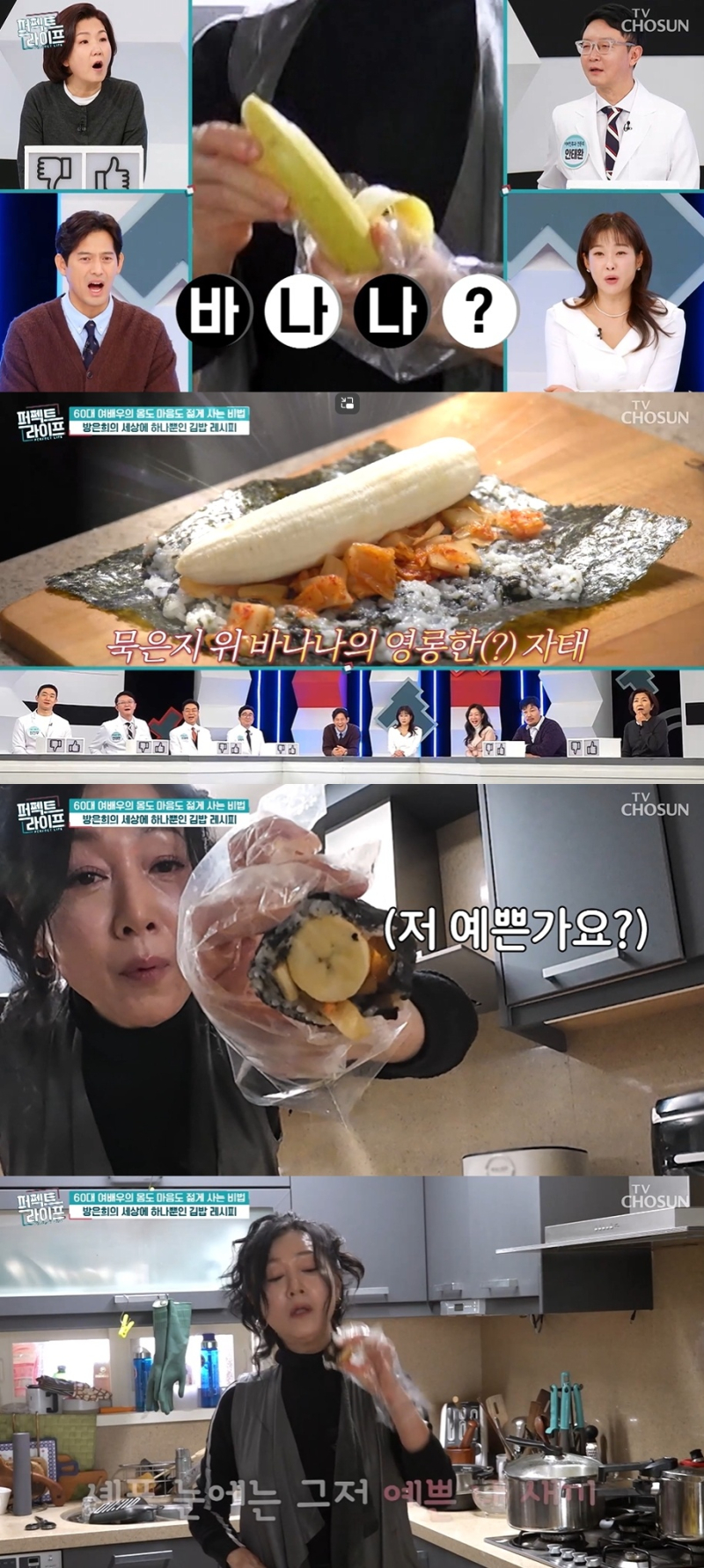 이날 방은희는 흰쌀밥에 김자반을 넣어 간을 맞추고, 묵은지를 주재료로 활용한 김밥을 만들었다. 그는 “평소에도 김치를 좋아해서 모든 것에 김치를 다 넣는다”고 소개했다.
