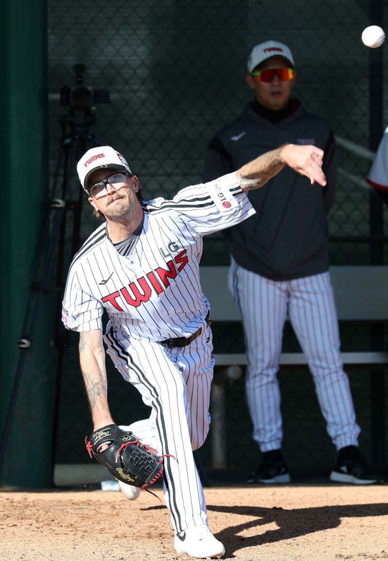 웰스가 28일(현지시간) 미국 애리조나 스프링캠프에서 첫 불펜 투구를 하고 있다. LG 트윈스는 지난해 키움 히어로즈 대체 외국인 선수로 활약한 라클란 웰스(29)를 구단 첫 아시아쿼터 선수로 맞았다.