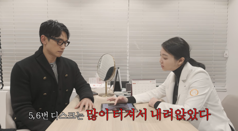 비는 “요즘 몸 상태가 예전 같지 않다”며 “경추 5, 6번 디스크 진단을 받았고, 요추 5, 6번이 협착증이다”라고 건강 상태를 이야기했다. 사진=유튜브 채널 ‘시즌비시즌’ 이를 들은 재활의학과 전문의는 MRI 결과를 함께 보면서 “경추의 정상적인 C자 커브가 무너져 있고, 5~6번 디스크가 많이 내려앉은 상태”라며 “허리 역시 퇴행성 변화와 염증이 보인다”고 설명했다. 이어 “비가 아니면 이미 다리 저림이 있을 거다. 근육이 받쳐줘서 지금 덜 아픈 것”이라고 덧붙였다.
