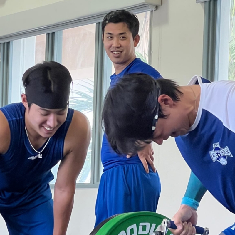 괌에서 진행되는 삼성 스프링캠프 도중, 이호성(오른쪽)이 원태인(왼쪽)의 다승왕 기념 티셔츠를 입고 훈련하고 있다. 삼성 라이온즈 SNS 캡쳐