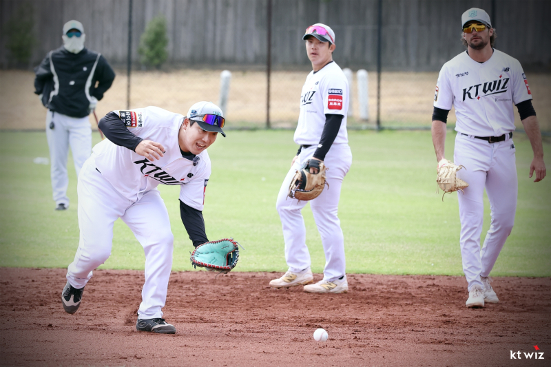프로 20년 차 베테랑 김현수는 올겨울 3년 총액 50억원에 KT로 이적했다. 그의 커리어만으로 후배들에게 주는 울림이 있다. 김현수는 올 시즌 좌익수를 맡을 예정이지만, 팀 상황에 따라 1루수로도 나설 수 있다. 땡볕 아래서 1루 수비 훈련을 한 그는 “6~7년 만에 1루 수비를 해본다. 외야는 언제든 가능하다. 감독님이 날 어떻게 쓰실지 모르기에 준비하는 것”이라고 말했다.
