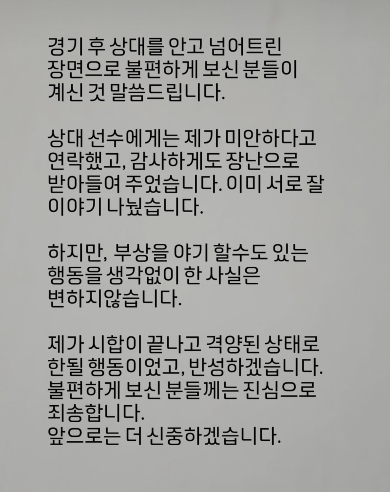 김상욱은 3일 소셜미디어(SNS)에 “경기 후 상대를 안고 넘어뜨린 장면으로 불편하게 보신 분들이 계신 것에 말씀드린다”며 “상대 선수에게는 미안하다고 연락했고, 감사하게도 장난으로 받아들여 줬다. 이미 서로 잘 이야기를 나눴다”고 적었다.