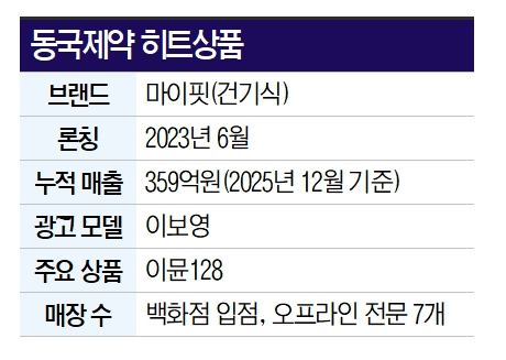 한국건강기능식품협회에 따르면 2025년 국내 건기식 시장 규모는 5조9626억원에 달했다. 10가구 중 8가구 이상이 건기식 구매 경험이 있을 정도로 대중화되고 있는 추세다. 동국제약은 건기식 시장 확대를 위해 마이핏 전문 매장을 계속 늘릴 계획이다.