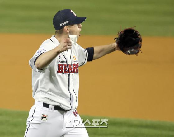 플렉센이 2020년 준플레이오프 1차전 6이닝을 마친 뒤 포효하고 있다. IS 포토 플렉센이 그해 준플레이오프 1차전에서 LG 트윈스를 상대로 6이닝 무실점 11탈삼진을 잡고 포효하는 장면은 아직도 두산 팬들의 기억에 생생하다. 에이스 부재로 고전했던 두산으로서는 그의 복귀는 더없이 굿 뉴스였다.