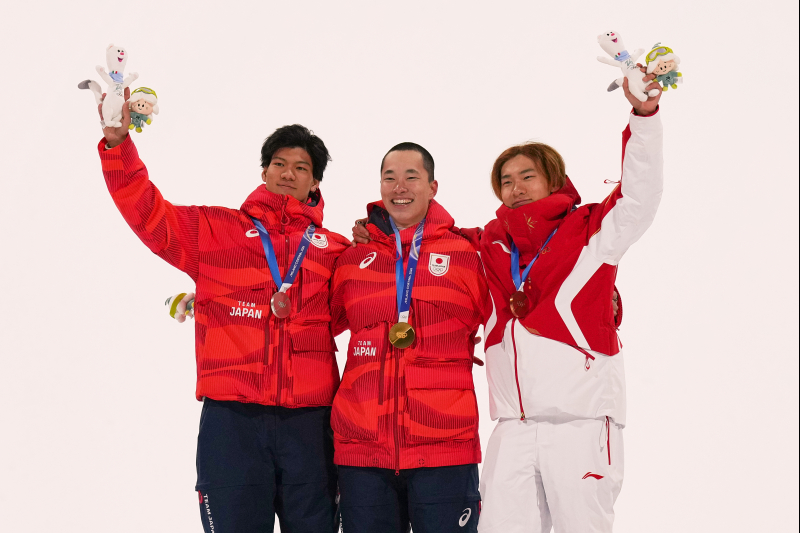 2026 밀라노-코르티나 동계올림픽 남자 스노보드 빅에어 메달리스트들. 왼쪽부터 은메달 기마타 료마, 금메달 기무라 기라, 동메달 쑤이밍. AP=연합뉴스