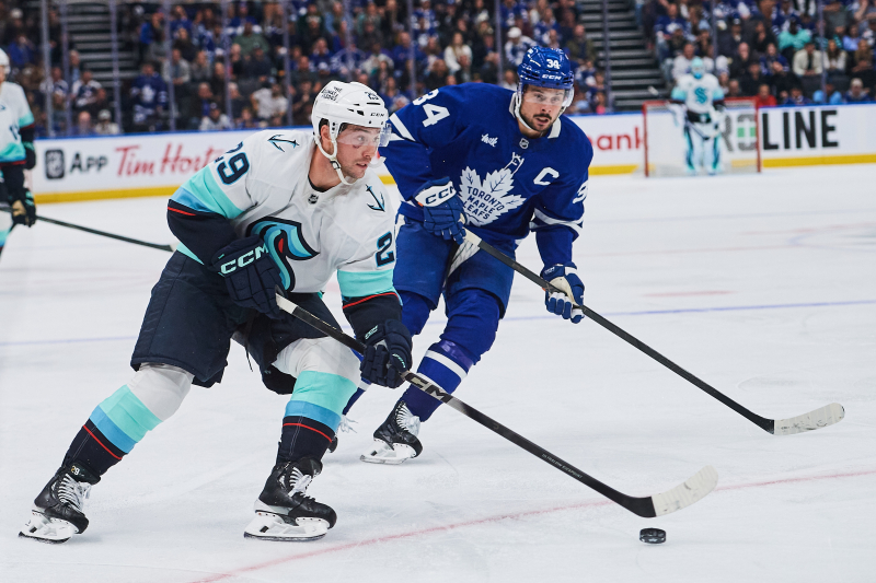 Seattle Kraken's Vince Dunn (29) and Toronto Maple Leafs' Auston Matthews (34) battle for the puck during the third period of an NHL hockey game in Toronto on Saturday, Oct. 18, 2025. (Sammy Kogan/The Canadian Press via AP) MANDATORY CREDIT/2025-10-19 11:21:00/ <저작권자 ⓒ 1980~2025 ㈜연합뉴스. 무단 전재 재배포 금지, AI 학습 및 활용 금지>