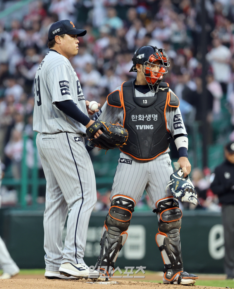 17일 오후 인천 SSG 랜더스필드에서 열린 2025 프로야구 한화와 SSG경기. 한화 선발 류현진이 1회 2실점한 뒤 마운드를 방문한 포수 최재훈과 얘기하고 있다. 인천=정시종 기자/2025.04.17.