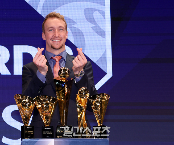 2023 KBO 프로야구 NC 다이노스 시절 에릭 페디. [사진 고척=김민규 일간스포츠 기자]2023 KBO 시상식이 27일 오후 서울 중구 소공동 웨스틴조선호텔에서 열렸다. MVP로 선정된 NC 페디가 시상식 후 트로피를 앞에 두고 포즈를 취하고 있다. [사진 김민규 일간스포츠 기자]