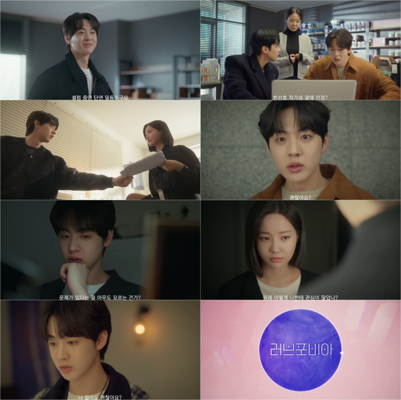 ‘러브포비아’ 측은 11일 아이돌급 인기를 자랑하는 로맨스 소설 작가 한선호(김현진)의 다채로운 매력이 담긴 캐릭터 티저 영상을 공개해 다가올 첫 방송을 기대케 했다.
