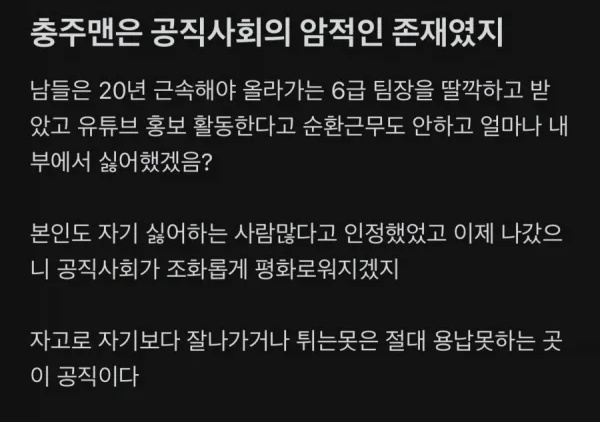 스타 공무원 ‘충주맨’ 김선태 주무관이 공직을 떠나는 사실이 알려진 후, 동료들의 익명 글이 이어지고 있다.