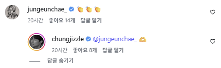 해당 게시물이 올라온 후 팬들과 지인들의 응원 댓글이 이어지고 있는 가운데, 정은채 역시 흔적을 남겼다. 그는 박수 이모티콘으로 연인을 응원했고, 김충재는 손하트 이모티콘으로 화답했다.