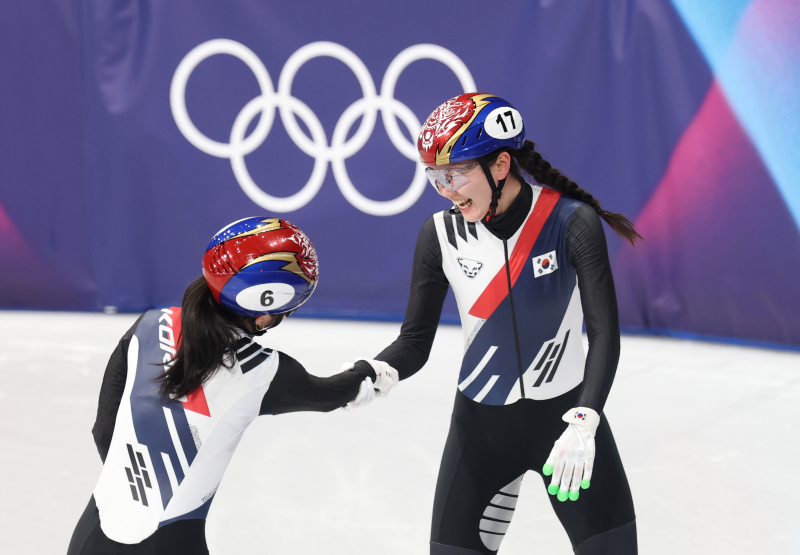 14일(현지시간) 이탈리아 밀라노 아이스스케이팅 아레나에서 열린 2026 밀라노-코르티나담페초 동계올림픽 쇼트트랙 여자 3000m 계주 준결승에 출전한 한국 김길리가 피니시라인을 1위로 통과한 뒤 심석희와 기뻐하고 있다. [사진=연합뉴스]