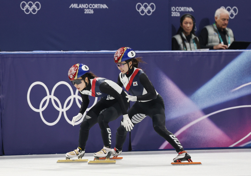 2026 밀라노-코르티나 동계올림픽 개막을 이틀 앞둔 4일(현지시간) 밀라노 아이스스케이팅 아레나에서 한국 쇼트트랙 최민정(5번)과 심석희가 대화하고 있다. [사진=연합뉴스]