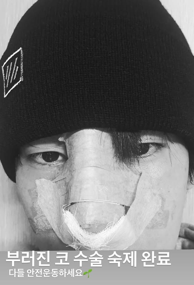 육준서는 최근 자신의 SNS에 “부러진 코 수술 숙제 완료. 다들 안전 운동하세요”라는 글과 함께 사진 한 장을 게재했다.