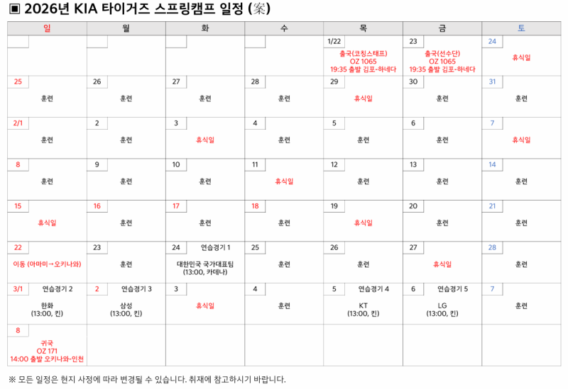 KIA는 "21일을 끝으로 1차 스프링캠프를 마치고, 2차 캠프를 위해 22일 오키나와로 이동한다"고 밝혔다. 코칭스태프 21명, 선수 42명 등 총 63명의 선수단이 참가한 가운데 열린 아마미오시마 1차 스프링캠프는 첫 두 턴은 4일 훈련 1일 휴식, 나머지 일정은 3일 훈련 1일 휴식으로 진행됐다. 체력 및 기술 훈련 위주로 일정을 소화한 선수단은 지난 20일 자체 홍백전까지 치르며 실전 돌입을 위한 예열을 성공적으로 마쳤다.