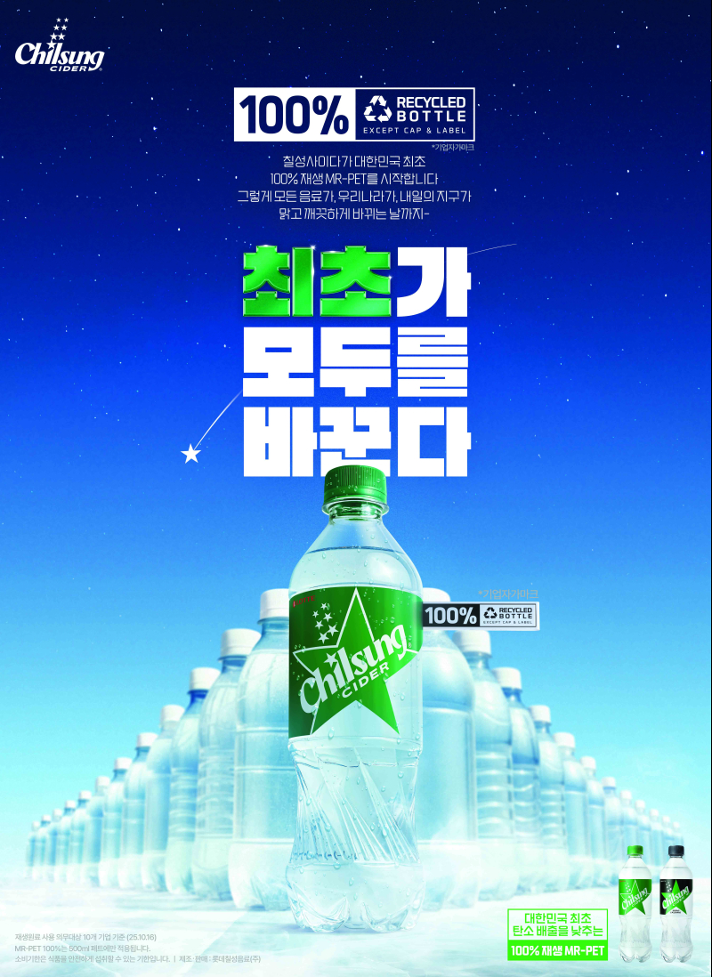 롯데칠성음료, 국내 첫 100% 재생 페트병 도입… 연간 2200톤 플라스틱·2900톤 탄소 배출 감소 효과