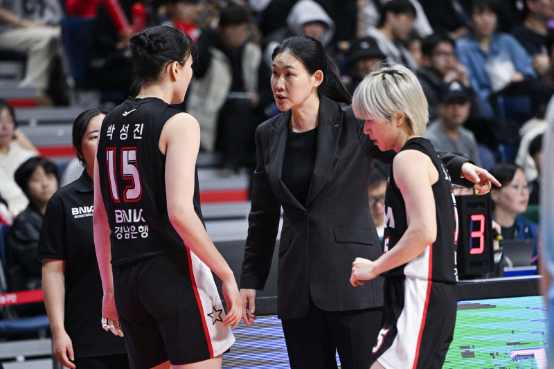 지난 22일 부산사직실내체육관에서 열린 2025~26 여자프로농구 인천 신한은행전에서 작전을 지시하는 박정은 BNK 감독. WKBL 제공
