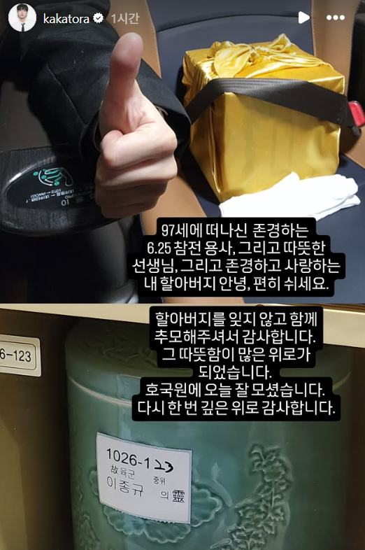 이어 “할아버지를 잊지 않고 함께 추모해 주셔서 감사합니다. 그 따뜻함이 많은 위로가 됐습니다. 호국원에 오늘 잘 모셨습니다. 다시 한번 깊은 위로 감사합니다”라고 덧붙였다.