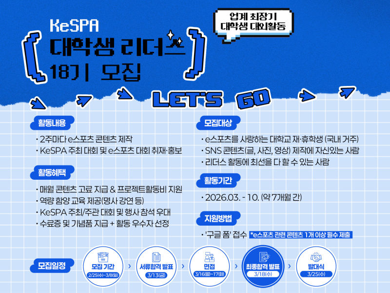 KeSPA 대학생 리더스는 e스포츠 리그 및 산업에 관심 있는 대학생(재·휴학생) 누구나 지원할 수 있다. 글쓰기·영상 및 이미지 제작·외국어 활용 능력 보유자를 우대한다. 지원 희망자는 직접 제작한 e스포츠 관련 콘텐츠 1부(형식 자유)를 함께 제출하면 된다. 모집 마감은 오는 3월 8일까지다.