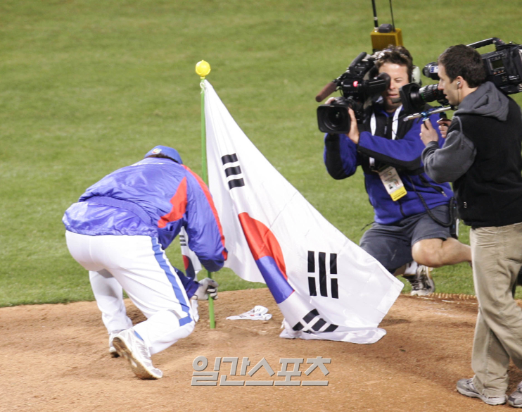 2006 월드베이스볼클래식(WBC) 2라운드 한국과 일본의 경기. 한국이 일본을 2-1로 승리하자, 서재응 투수가 태극기를 투수 마운드 가운데 꽂고 있다. [사진 일간스포츠 DB]