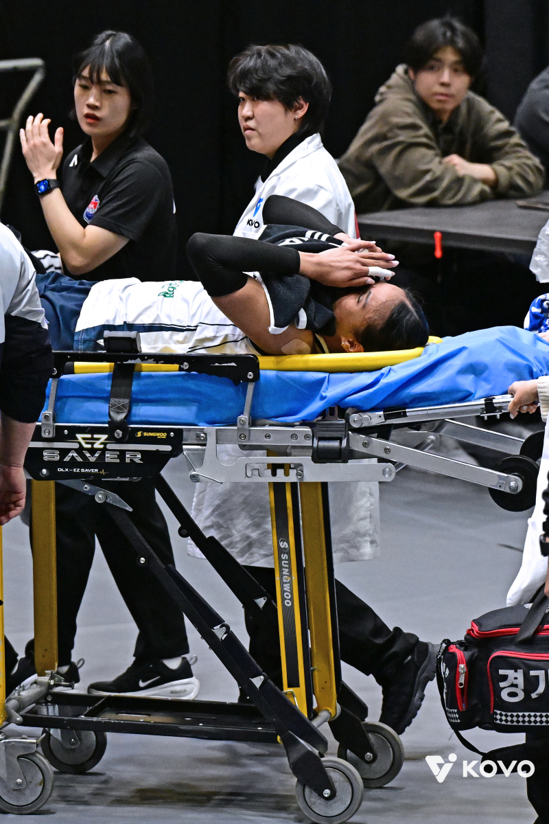 24일 현대건설전에서 부상을 당한 타나차. 사진=KOVO 2025~26 V리그 여자부에서 불안한 선두를 지키는 한국도로공사가 삼각편대의 한 축인 아시아 쿼터 선수 타나차 쑥솟(등록명 타나차)의 부상 악재로 정규리그 1위 수성에 비상이 걸렸다.