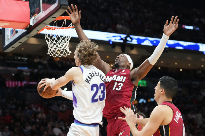 Miami Heat center Bam Adebayo (13) fouls Utah Jazz forward Lauri Markkanen (23) during the second half of an NBA basketball game Monday, Feb. 9, 2026, in Miami. (AP Photo/Marta Lavandier)/2026-02-10 12:42:15/ <저작권자 ⓒ 1980~2026 ㈜연합뉴스. 무단 전재 재배포 금지, AI 학습 및 활용 금지>