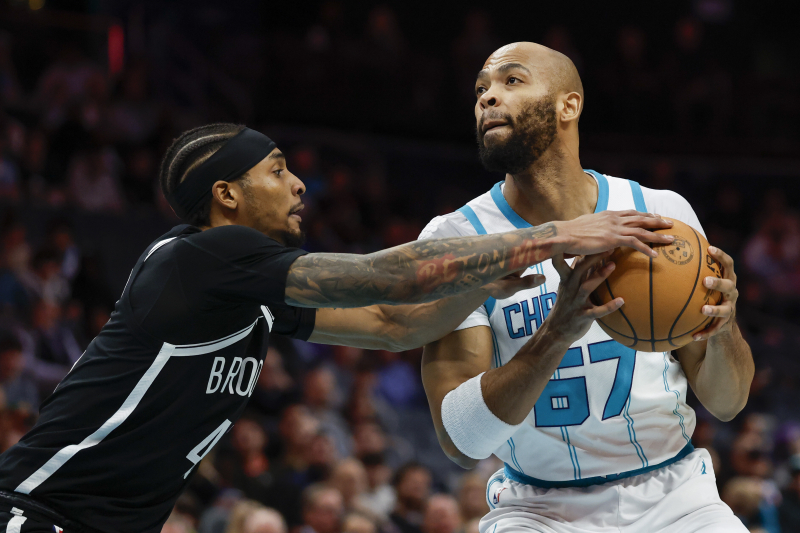 Charlotte Hornets forward Taj Gibson (67) drives to the basket against Brooklyn Nets guard Keon Johnson during the first half of an NBA basketball game in Charlotte, N.C., Wednesday, Jan. 29, 2025. (AP Photo/Nell Redmond)/2025-01-30 10:03:18/ <저작권자 ⓒ 1980~2025 ㈜연합뉴스. 무단 전재 재배포 금지, AI 학습 및 활용 금지>