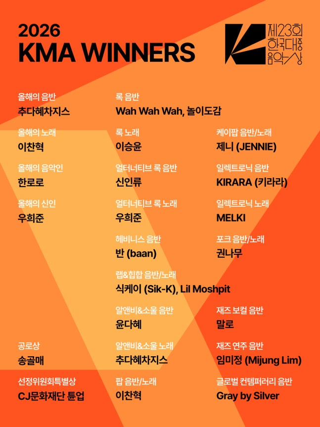 그룹 악동뮤지션 이찬혁이 솔로 2집 ‘에로스’로 ‘제23회 한국대중음악상 위드(with) 카카오창작재단’에서 3관왕에 올랐다. 블랙핑크 제니는 2관왕을 차지했다.