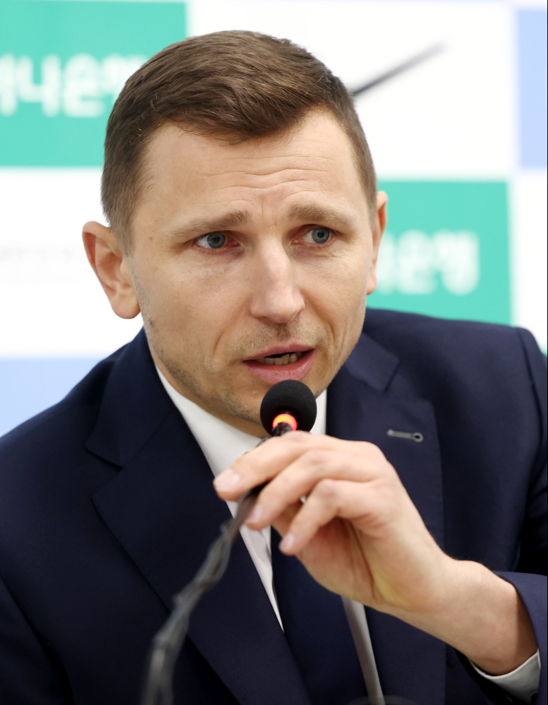 농구 대표팀 니콜라이스 마줄스 감독이 4일 서울 올림픽회관에서 남자 농구 국가대표 명단 발표를 하고 있다. 2026.2.4 [연합뉴스]