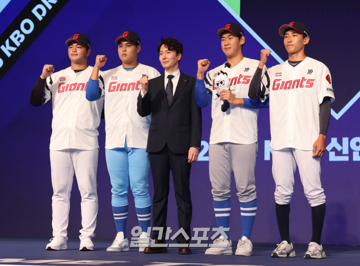 2025 KBO 신인 드래프트가 11일 오후 서울 송파구 롯데호텔월드 크리스탈볼룸에서 열렸다. 롯데에 지명된 신인선수들이 박준혁 단장과 포토타임을 갖고있다. 잠실=정시종 기자 /2024.09.11.