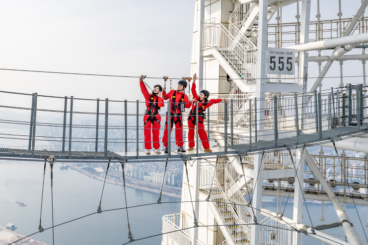 스카이브릿지는 지상 541m 높이에서 롯데월드타워 최상단 루프 사이 11m 길이의 다리를 건너는 고공 어트랙션이다. 서울 하늘을 가장 가까이서 즐길 수 있는 이 장소는 영화 ‘탑건: 매버릭’ 팀의 내한 촬영 등 글로벌 콘텐츠의 배경으로 유명하다.