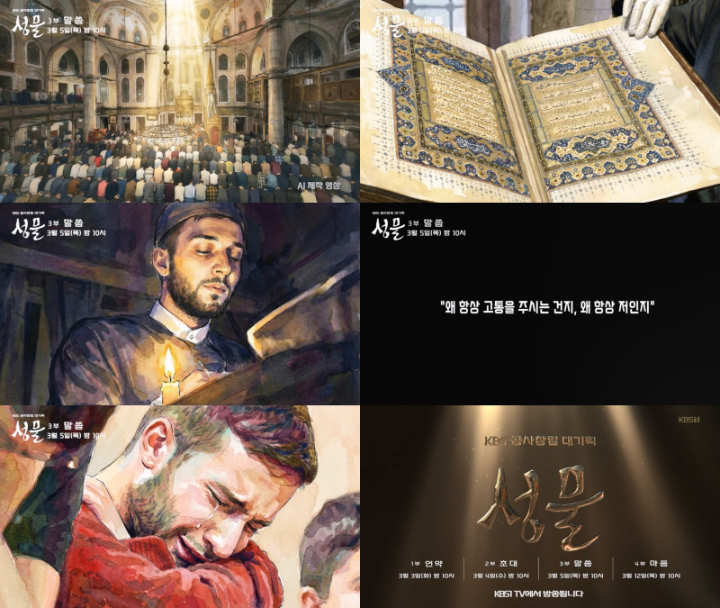 배우 김희애가 내레이션을 맡은 KBS 공사창립 대기획 4부작 다큐멘터리 ‘성물’ 3부 ‘말씀’에서 무슬림의 일상 속에 스며있는 알라의 말씀 ‘쿠란’을 조명한다. 사진=KBS1 제공. ‘성물’은 본편에서 촬영된 영상을 바탕으로 AI 기술로 그림을 재창조하고, AI 음악까지 사용하는 독특한 형식으로 AI 티저를 만들어 본편을 미리 엿볼 수 있도록 했다.