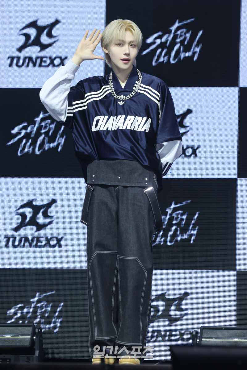 튜넥스(TUNEXX) 시환이 3일 오후 서울 광진구 예스24라이브홀에서 열린 첫 번째 미니앨범 'SET BY US ONLY(셋 바이 어스 온리)' 발매 기념 쇼케이스에 참석해 포토타임을 갖고 있다.