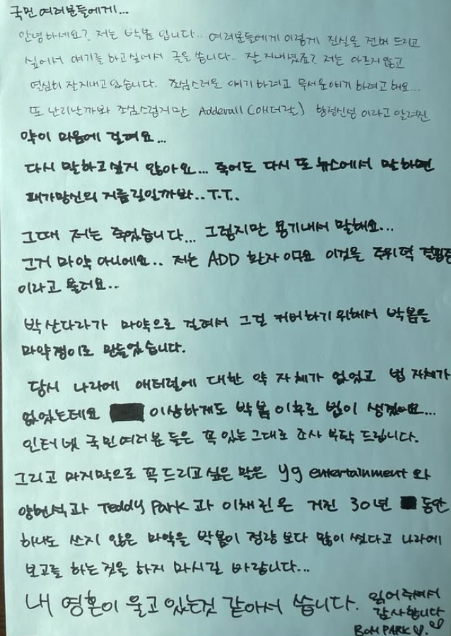 박봄은 3일 자신의 SNS에 자신이 쓴 것으로 보이는 손편지 사진을 올렸다. 편지에서 박봄은 “조심스러운 얘기, 무서운 얘기 하려고 한다. 또 난리 날까봐 조심스럽지만 애더랄 향정신성이라고 알려진 약이 마음에 걸린다”며 “다시 말하고 싶지 않다. 죽어도 다시 또 뉴스에서 말하면 패가망신의 지름길 일까봐”라고 말문을 열었다.