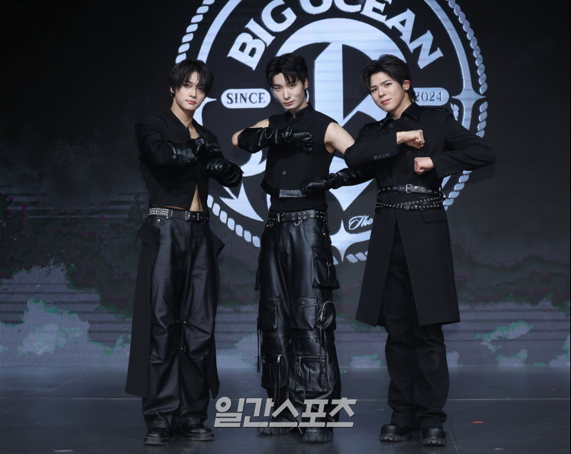 빅오션(Big Ocean) PJ, 지석, 찬연이 3일 오후 서울 마포구 쇼킹케이팝센터에서 열린 세 번째 미니앨범 'THE GREATEST BATTLE' 발매 기념 쇼케이스에 참석해 포토타임을 갖고 있다.