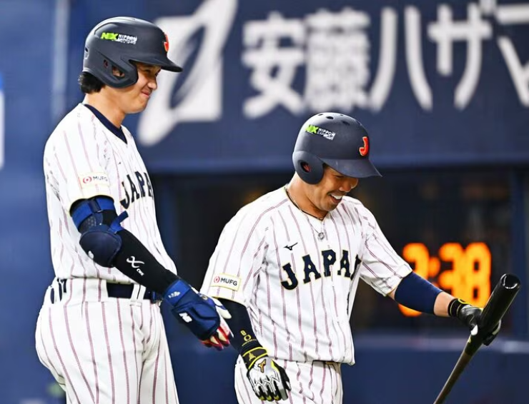 오타니의 헬멧. [사진 히가시스포]오타니 쇼헤이(왼쪽)의 헬멧이 다른 대표팀 선수와 다른 모습을 확인할 수 있다. [사진 히가시스포]