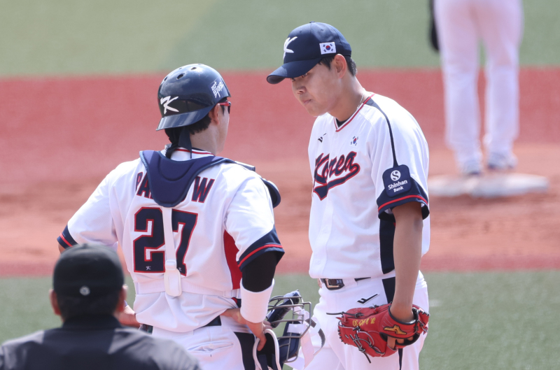 26일 일본 오키나와현 가데나의 가데나 구장에서 열린 2026 월드베이스볼클래식(WBC) 대한민국 야구대표팀과 삼성 라이온즈 연습경기. 2회초 안타를 허용한 뒤 포수 박동원과 이야기를 하고 있다. 2026.2.26 [연합뉴스]
