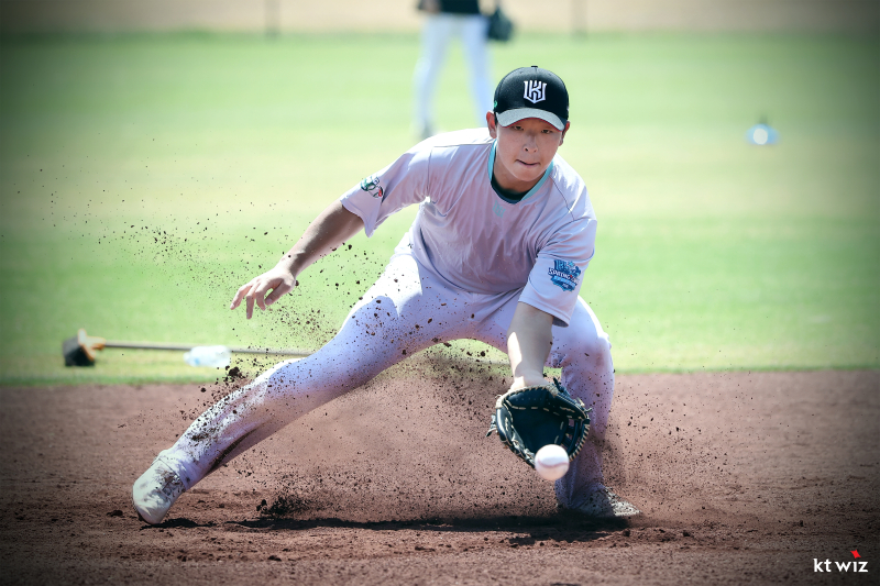 KT에도 특별한 '6번'을 단 선수가 있다. 바로 신인 내야수 이강민(19)이다. KT의 6번은 오랫동안 주전 내야수이자 수비의 심장으로 활약했던 박경수 코치의 상징과도 같은 번호다. 박 코치가 은퇴한 2024시즌 후에는 1년간 결번 상태이기도 했다. 그랬던 6번이 신인에게 돌아갔다. 심재훈과 마찬가지로 이강민도 등번호 6번과 함께 '수비 달인'의 기운을 물려받았다.