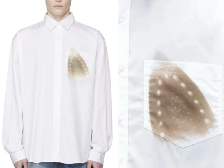 프랑스 스트리트 패션 브랜드 베트멍은 최근 발표한 2026년 봄·여름 시즌 컬렉션에서 ‘화이트 아이로닝 번 그래픽 셔츠’를 선보였다. 흰 셔츠 가슴 부위에 다림질을 하다 태운 듯한 자국을 그대로 프린트한 것이 특징이다. 이 옷의 가격은 1139달러(약 165만원)다.